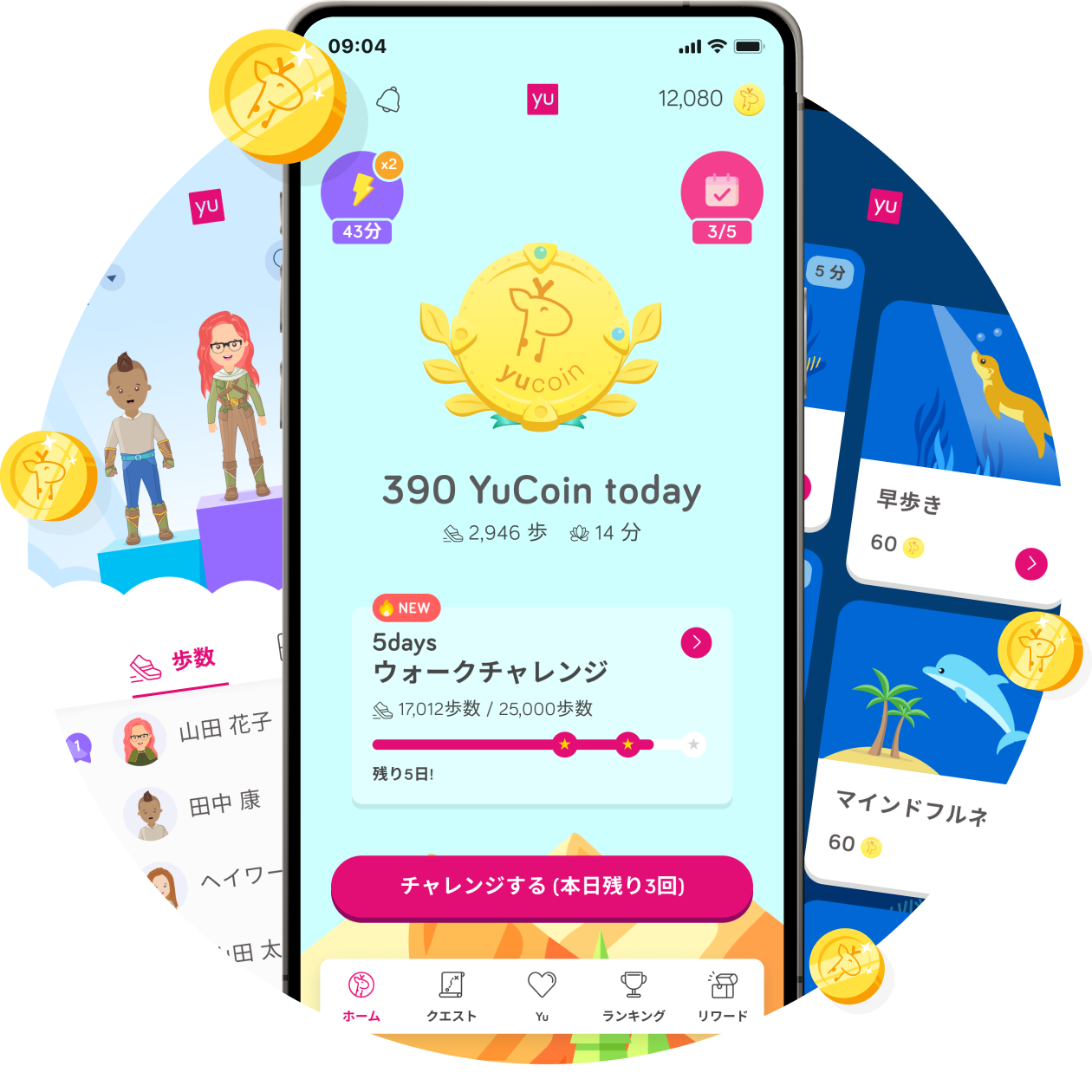 A: 日々の健康活動やチャレンジ達成で貯まる「YuCoin」は、Amazonギフト券をはじめ、好きなブランドのクーポンと交換したり、慈善団体への寄付などにも活用できます。