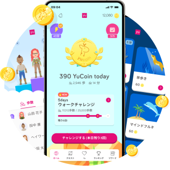 A: 日々の健康活動やチャレンジ達成で貯まる「YuCoin」は、Amazonギフト券をはじめ、好きなブランドのクーポンと交換したり、慈善団体への寄付などにも活用できます。